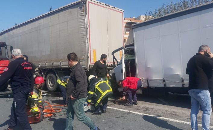 TEM otoyolu Dilovası geçişinde tekerleği çıktığı için yol kenarında duran tıra, kamyonet arkadan çarptı. Sürücü araçta sıkışırken, yol uzun süre trafiğe kapatıldı.