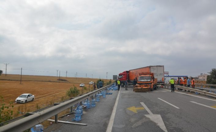 Tırdan yola dökülen su dolu damacanaları kendi araçlarına aldılar