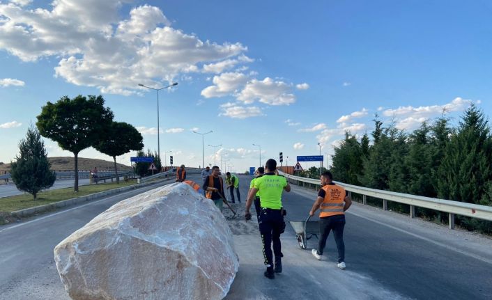 Afyonkarahisar’da tırın dorsesinden karayoluna tonlarca ağırlığında mermer blok düştü. Olay esnasında karayolun boş olması ise olası facianın önüne geçti.