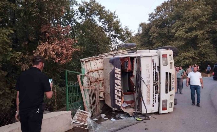 Karabük’ün Yenice ilçesinde tomruk yüklü kamyonun kontrolünden çıkarak devrildiği kazada sürücü yaralandı.