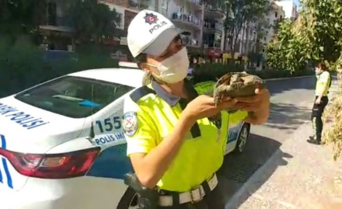 Aydın’da devriye görevinde bulunan trafik polisleri, yol ortasında fark ettikleri kaplumbağayı hem ezilmekten hem de üzerine yapışan keneden kurtardı.