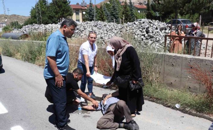 Sivas’ta vatandaşlar, trafik kazasında yaralanan yaşlı adamın sıcaktan etkilenmemesi için ambulans gelene kadar başında bez parçasıyla gölgelik yaparak beklediler.
