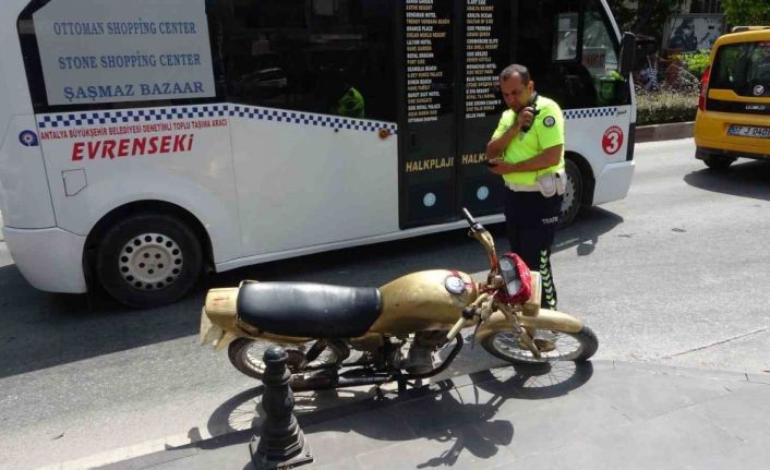 Edinilen bilgiye göre, Manavgat Antalya Caddesi’nde Şelale istikametine seyir halindeki Manavgat Emniyet Müdürlüğü Trafik Denetleme Büro Amirliği’ne bağlı ekip, plakasız motosiklet sürücüsüne durması için uyarıda bulundu. Trafiğin yoğun olması nedeniyle kaçamayacağını anlayan motosiklet sürücüsü ve arkasındaki kişi, motosikleti olay yerinde bırakarak kaçtı.