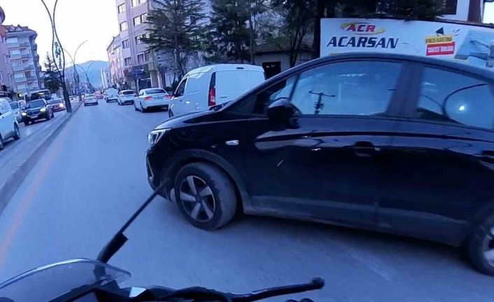 Bolu’da aniden yola çıkarak motosikletliyi tehlikeye atan ve ardından "Hatalı sollama yaptın" diyerek polise şikayette bulunan otomobil sürücüsünün haksız olduğu, kask kamerası görüntüleriyle ortaya çıktı. Görüntüleri izleyen sürücü hatasını kabul etmek zorunda kaldı.