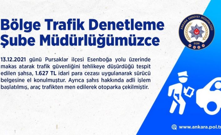 Ankara Emniyet Müdürlüğü Bölge Trafik Denetleme Şube Müdürlüğünce, Ankara’nın Pursaklar ilçesi Esenboğa yolu üzerinde, makas atarak trafik güvenliğini tehlikeye düşürdüğü tespit edilen şahsa, bin 627 TL idari para cezası uygulanarak sürücü belgesine el konuldu. Ayrıca sürücü hakkında adli işlem başlatılarak, araç trafikten men edildi ve otoparka çekildi.