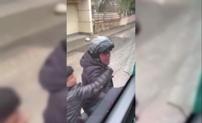 Adana’da trafikte yol verme meselesi yüzünden çıkan tartışmada motosiklet sürücüsü, kaskıyla servis aracının camını kırdı. O anlar cep telefonu kamerasına yansıdı.
