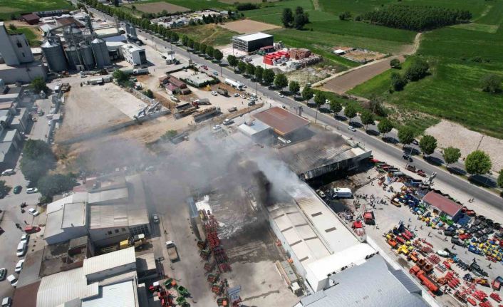 Sakarya’nın Adapazarı ilçesinde bulunan Zirai Aletler Sanayi Sitesi içindeki traktör bayisinin deposunda çıkan yangın ve söndürme çalışmaları havadan görüntülendi.