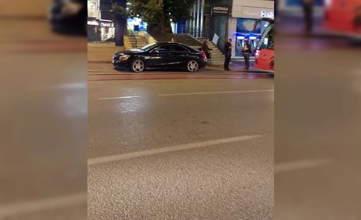 İhbar üzerine olay yerine gelen polis ekipleri, sürücüye ulaşarak aracı tramvay hattından kaldırdı.