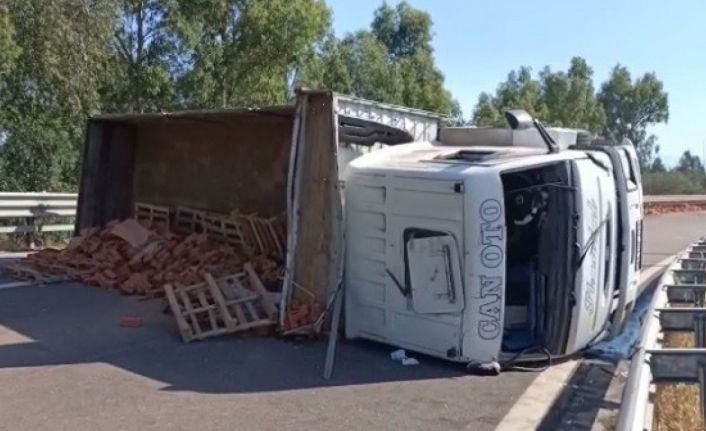 Tuğla yüklü kamyon devrildi, otoyol trafiğe kapandı