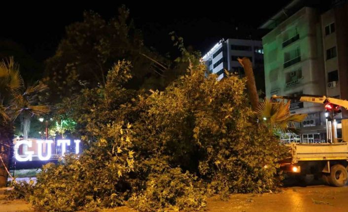 Manisa’nın Turgutlu ilçesinde akşam saatlerinde yaşanan fırtına sebebiyle en işlek caddesinde bulunan çınar ağacı devrildi. Olayda can veya mal kaybı yaşanmazken, yaklaşık bir saatlik çalışma sonunda devrilen ağaç budanarak kaldırıldı.