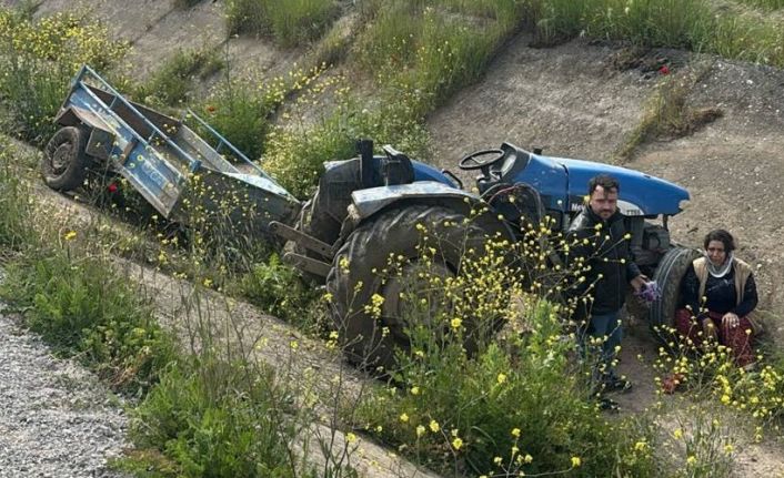Manisa’nın Turgutlu ilçesinde ön lastiği çıkan traktörün takla atarak kanala savrulması sonucu 2 kişi yaralandı.