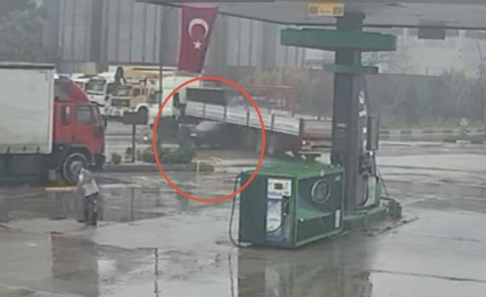 Öte yandan, kaza anı akaryakıt istasyonunun güvenlik kameraları tarafından anbean kaydedildi. Görüntülerde tırın manevra yaptığı sırada otomobilin duramayarak dorsenin altına girdiği görülüyor.