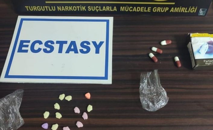 Manisa’nın Turgutlu ilçesinde Turgutlu İlçe Emniyet Müdürlüğüne bağlı Narkotik Suçlarla Mücadele Grup Amirliği ile Asayiş Büro Amirliği ekiplerinde uyuşturucu ticarete yapan şahıslara yönelik yapılan çalışmalarda 104 adet ekstasy hap, 4 adet sentetik ecza, 26 gram esrar, 1 gram metamfetamin ve hassas terazi ele geçirildi. 5 şahıs gözaltına alınırken 2 şahıs emniyet işlemlerinin ardından serbest kaldı. Diğer 3 şahıs sevk edildikleri adli mercilerce tutuklanarak cezaevine gönderildi.