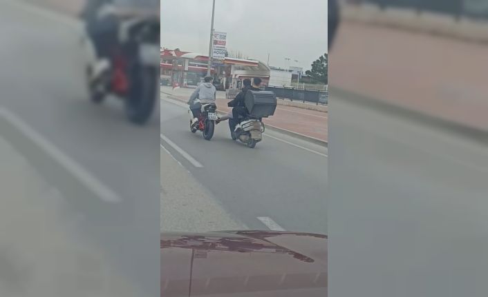 Bursa’da bozulan motosikleti başka bir motosiklet ile iterek tamirhaneye götüren gençler kameraya yakalandı.