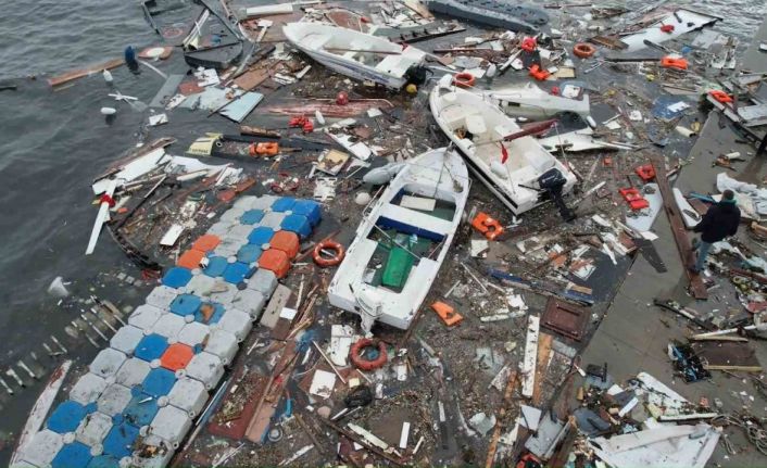 Fırtına sonrası sahil kesiminde oluşan tahribat ve teknelerde meydana gelen ağır hasar havadan görüntülendi. Dronla kaydedilen görüntülerde, alabora olan tekneler, parçalanan gövdeler ve sahil boyunca oluşan hasarın boyutu net şekilde ortaya çıktı.