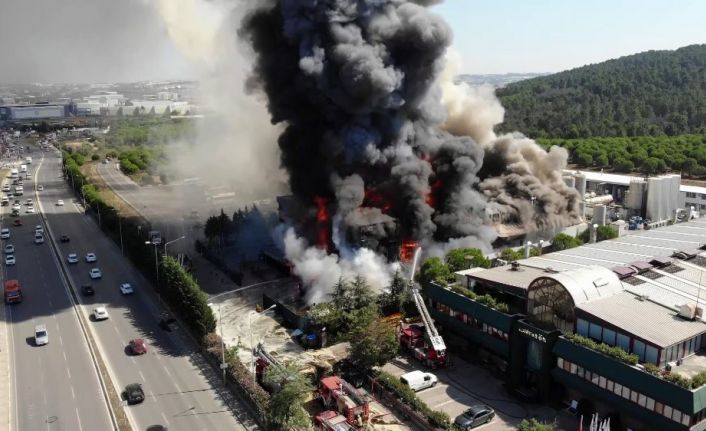 Tuzla Deri Sanayi’de bir fabrikada çıkan yangın giderek büyüyor. Yangında son durum havadan görüntülenirken, yer yer patlamalar oluyor. Öte yandan fabrikanın bahçesindeki bazı araçların da yandığı görülüyor.