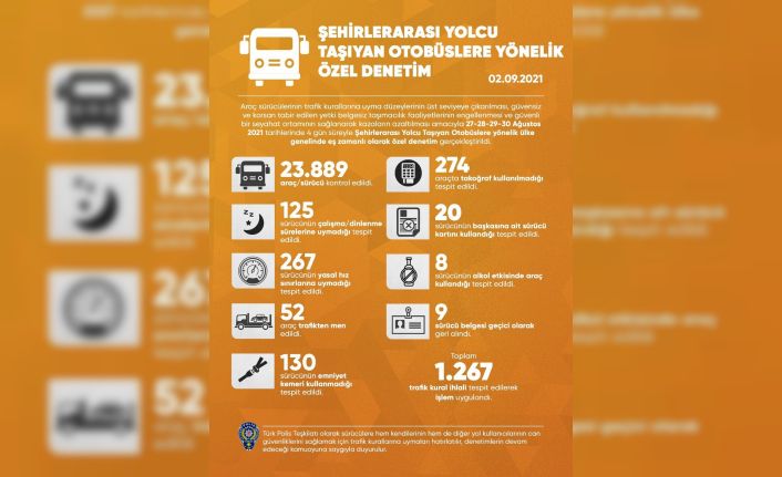 Emniyet Genel Müdürlüğü, trafikte güvenli yolculuğun sağlanması, kural ihlallerinin önüne geçilmesi ve yasadışı taşımacılık faaliyetlerinin önlenmesi amacıyla 27-30 Ağustos tarihleri arasında yurt genelinde Şehirlerarası Yolcu Taşıyan Otobüslere yönelik eş zamanlı denetim gerçekleştirildiğini duyurdu.