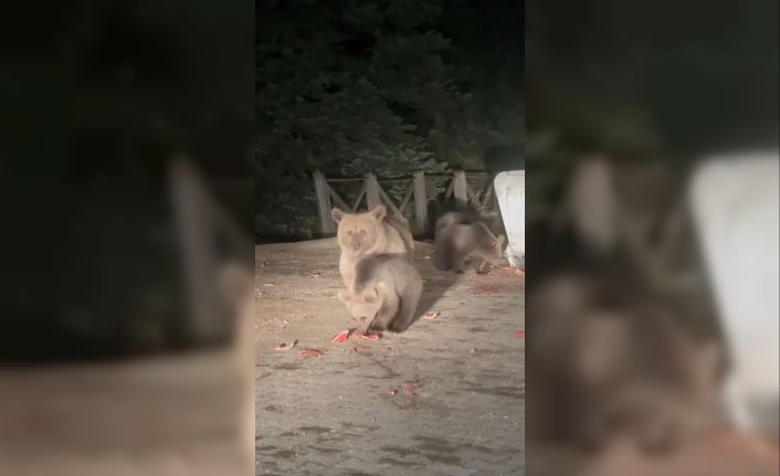 Uludağ’da karnı acıkan ayı ailesi çöp konteynerlerini karıştırıp yiyecek aradı. Ayıların karpuz yediği anlar bir vatandaş tarafından kayıt altına alındı.
