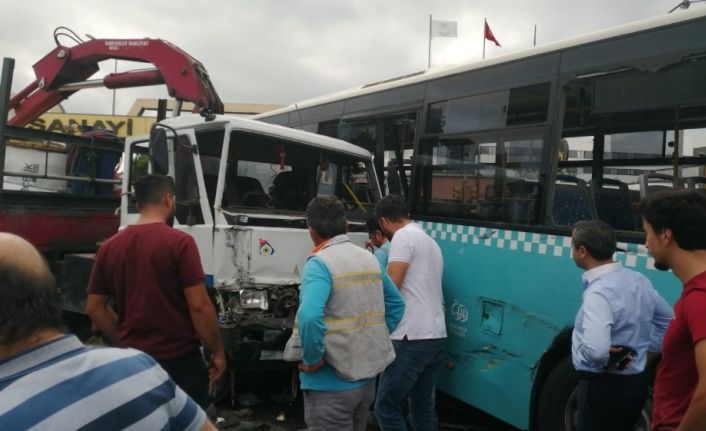 Ümraniye Dudullu’da bir vinç özel halk otobüsüne çarptı. Kazada 9 kişi yaralanırken araçlarda büyük hasar meydana geldi.