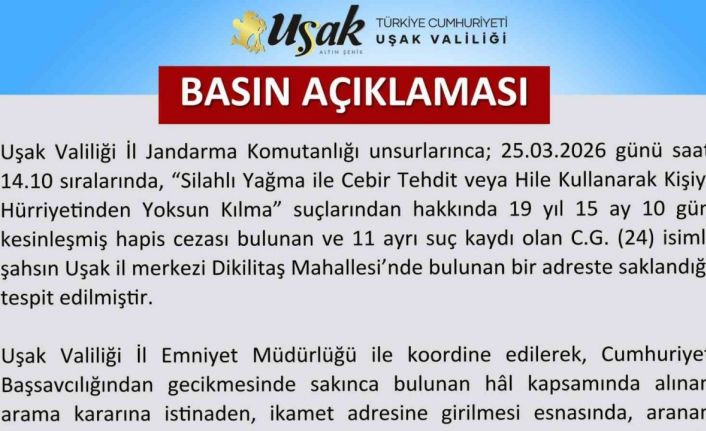 Uşak Valiliği’nden sosyal medya üzerinden yapılan açıklamada, "silahlı yağma" ile "cebir, tehdit veya hile kullanarak kişiyi hürriyetinden yoksun kılma" suçlarından aranan C.G. (24)’nin Dikilitaş Mahallesi’nde saklandığının tespit edildiği belirtildi. İl Jandarma Komutanlığı ekiplerinin, Uşak İl Emniyet Müdürlüğü ile koordineli olarak adrese düzenlediği operasyonda, şahsın güvenlik güçlerine teslim olmaması üzerine arbede yaşandığı, arbede sırasında yaralanan şahsın hastaneye kaldırıldığı ancak tüm müdahalelere rağmen kurtarılamadığı ifade edildi. Olayın ardından adli ve idari soruşturma başlatıldığı, sürecin tüm yönleriyle titizlikle sürdürüldüğü bildirildi.