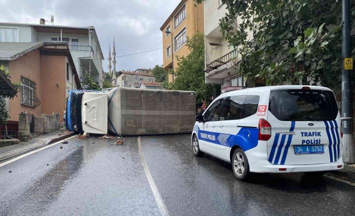 Üsküdar’da yokuş aşağıya inen kamyon yağmur sonrası kayganlaşan yolda kayarak kaza yaptı. Sürücüsünün hakimiyetini kaybettiği kamyon önce bir evin duvarı ve doğalgaz kutusuna çarptı daha sonrada devrildi. Kazada araç içerisinde bulunan 3 kişi burnu bile kanamadan çıkartıldı.