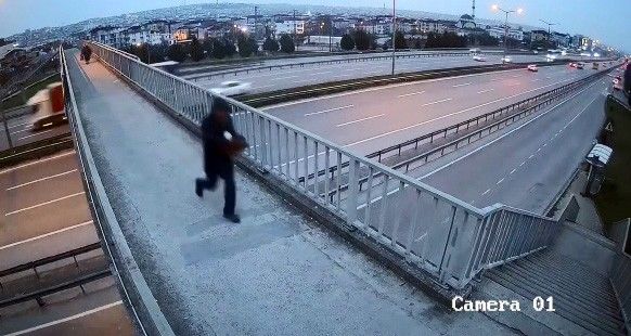 Öte yandan, olay anı ise güvenlik kamerasına yansıdı. Saniye saniye kaydedilen olayda İ.E. isimli şahsın üst geçitte yürürken, karşı yönden gelen kadının üzerine atlayarak çantasını zorla aldığı görülüyor. Yaşanan boğuşma sırasında kadın yere düşerken şahıs, çantayı zorla alıp koşarak uzaklaşıyor. Yerden kalkan kadın ise gaspçının arkasından koşuyor.