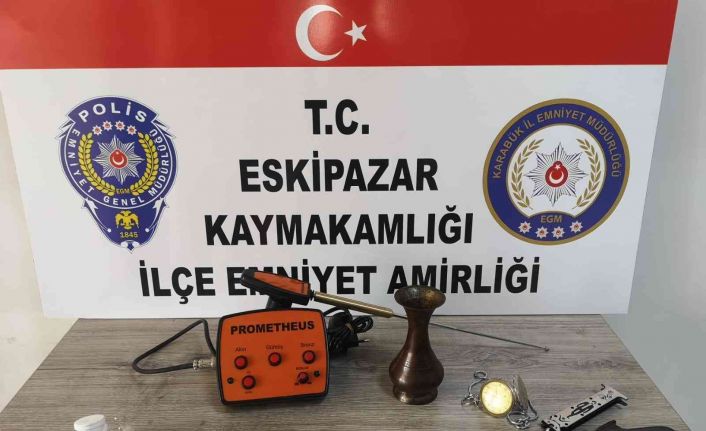 Edinilen bilgiye göre Eskipazar ilçesinde sabah saat 04.30 sıralarında ilçede yapıkları genel asayiş uygulaması sırasında polis ekipleri F.Ö idaresindeki bir aracı durdurdu. Ekiplerin araçta yaptığı aramada bir adet 7,65mm çaplı ruhsatsız tabanca ve kesici alet ile, 0,35 gram bonzai, 2,40 gram metamfetamin ve uyuşturucu kullanımında kullanılan 2 adet apart, ayrıca bir adet bakır vazo, bir adet köstekli saat ve define aramada kullanılan dedektör ele geçirildi.