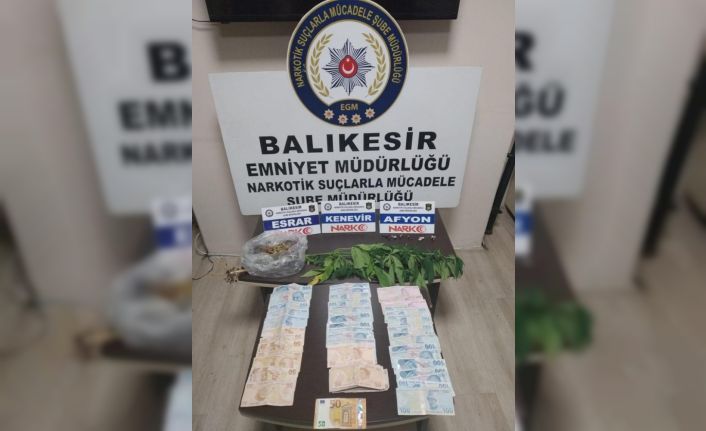 Edinilen bilgiye göre, Balıkesir Emniyet Müdürlüğü Narkotik Suçlarla Mücadele Şube Müdürlüğü ekipleri yabancı uyruklu F.P.’nin ikametine uyuşturucu madde ticareti yaptığı ve kenevir bitkisi yetiştirdiği iddiası üzerine baskın yaptı. Şüpheliye ait ikamet aramasında 6,52 gram Afyon sakızı, 13,51 gram esrar ve 1 kök kenevir bitkisi ile birlikte bu ticaretten elde edildiği değerlendirilen 5 bin 240 TL. ve 50 Euro para ele geçirdi. Gözaltına alınan F.P adliyeye sevkedildi.