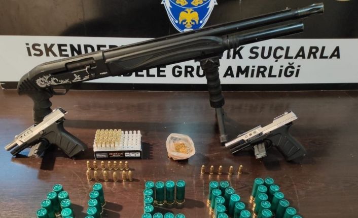 E.Y. isimli şahsın ikametinde yapılan aramada 1 tabanca, 1 şarjör, 42 tabanca mermisi,1 parça halinde 12 gram gelen sentetik uyuşturucu, İ.Ç. isimli şahsın ikametinde yapılan aramada ise 1 tabanca ve bu tabancayla ait 1 şarjör, 5 tabanca mermisi, 1 av tüfeği, 90 fişek ele geçirildi.