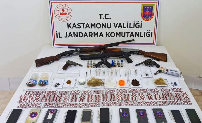 Öte yandan, operasyonda yapılan aramada 840 adet sentetik ecza hapı, 168.76 gram kubar esrar, 71.48 gram uyuşturucu veya uyarıcı metamfetamin, 24 gram bonzai, 134,12 gram cam kavanoz içerisinde sıvı uyuşturucu madde, 13 adet uyuşturucu veya uyarıcı madde kullanmaya yarayan cam pipo, 5 adet 0,5 litre uyuşturucu veya uyarıcı madde kullanmaya yarayan plastik pet şişesi, 1 adet esrar maddesi öğütmeye yarayan değirmen, 3 adet av tüfeği, 2 adet 9 mm çapında tabanca ile 1 adet kuru sıkı tabanca ele geçirildi.