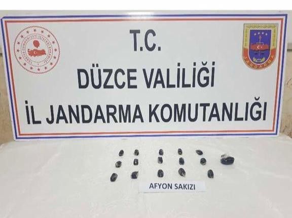 İstanbul’dan Zonguldak’a giden yolcu otobüsünü akşam saatlerinde D-655 Karayolu Düzköy mevkiinde durduran Düzce İl Jandarma Komutanlığı ekipleri, otobüste ve yolcuların üzerinde arama yaptı. Tavırlarından şüphelendikleri Y. A. isimli şahsın üst ve el bagajında da arama yapan ekipler 240 gram afyon sakızı tabir edilen uyuşturucu madde ele geçirdi. Hakkında uyuşturucu madde imal ve ticaretinden işlem başlatılan şahıs gözaltına alındı.