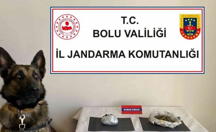 Bolu’da TEM Otoyolu üzerinde durdurulan yolcu otobüsündeki 2 şüpheli, çantasında taşıdığı 175 gram esrarla dedektör köpeği Asır’a yakalandı.