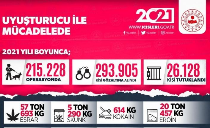 İçişleri Bakanlığınca uyuşturucu ile mücadele kapsamında geçen yıl düzenlenen 215 bin 228 operasyonda 293 bin 905 kişi gözaltına alınırken, bunlardan 26 bin 128’i tutuklandı. Operasyonlarda rekor miktarda uyuşturucu madde ele geçirildi.