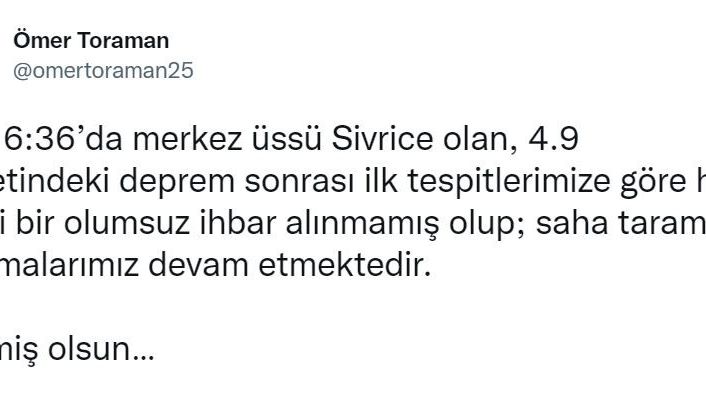 Vali Toraman paylaşımında “Saat 6:36’da merkez üssü Sivrice olan, 4.9 şiddetindeki deprem sonrası ilk tespitlerimize göre herhangi bir olumsuz ihbar alınmamış olup; saha tarama çalışmalarımız devam etmektedir. Geçmiş olsun“ dedi.
