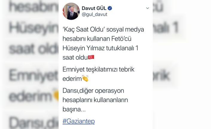 Gaziantep Valisi Gül, yaptığı paylaşımda, "’Kaç Saat Oldu’ sosyal medya hesabını kullanan FETÖ’cü Hüseyin Yılmaz tutuklanalı 1 saat oldu. Emniyet teşkilatımızı tebrik ederim. Darısı diğer operasyon hesabı kullananların başına" ifadelerini kullandı.