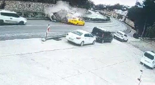 Muğla’nın Bodrum ilçesinde virajı alamayan otomobil refüje çarpıp karşı şeride geçerek taksiyle çarpıştı. O anlar güvenlik kamerası tarafından anbean kaydedildi.