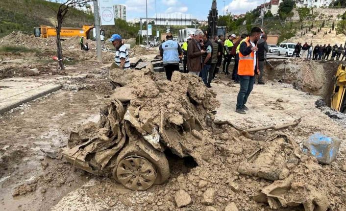 Ankara’da dün yağan yağmurun ardından çöken alt yapı sonucu yollar sel suları ile dolarken logar kapağına takılarak kanalizasyona düşen otomobilin hurdası çıkarıldı.