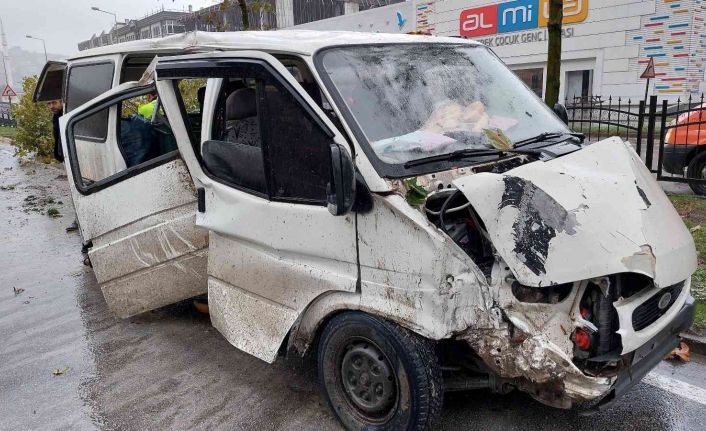 Yağmurdan kayan minibüs direğe ve ağaca çarptı