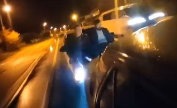 Yakıtı biten aracı diğer aracın kaputuna oturup ayakları ile ittiler