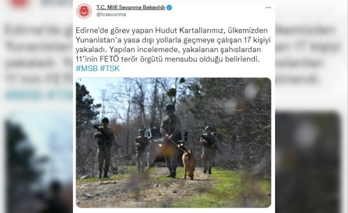 Milli Savunma Bakanlığınca resmi sosyal medya hesabı üzerinden yapılan açıklamada, “Edirne’de görev yapan Hudut Kartallarımız, ülkemizden Yunanistan’a yasa dışı yollarla geçmeye çalışan 17 kişiyi yakaladı. Yapılan incelemede, yakalanan şahıslardan 11’inin FETÖ terör örgütü mensubu olduğu belirlendi” denildi.