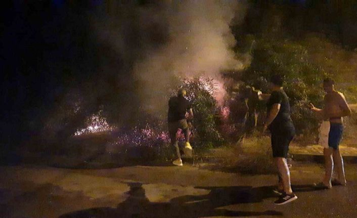 Bodrum Gazeteciler Cemiyeti Gecesi’nin ardından evlerine giden basın mensupları yol kenarında çıkan yangını görünce yangını çekmek yerine söndürmeyi tercih ettiler. Kısa bir çekim yaptıktan sonra etrafta kimsenin olmadığını görünce yangın tüpleriyle alevlere müdahale eden gazeteciler, yangını büyümeden kontrol altına aldı.