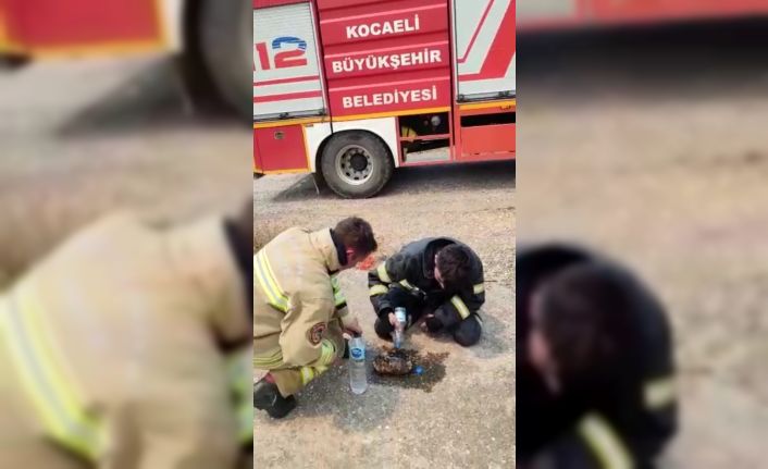 Antalya Manavgat’ta çıkan orman yangınları için Kocaeli’den bölgeye giderek alevlerle mücadele eden itfaiye erleri, alevlerin arasından kurtardıkları kaplumbağaya elleri ile su verdi.
