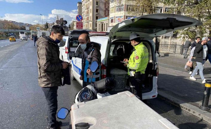 İstanbul’da etkisini gösteren hava muhalefeti nedeniyle İstanbul Valiliği tarafından alınan kararla saat dün saat 23.00’dan bugün saat 18.00’a kadar motosikletli kuryelik yapılması, motosiklet ve elektrikli scooterların kullanılması yasaklandı. İstanbul Emniyet Müdürlüğü Trafik Denetleme Şube Müdürlüğü ekipleri alınan karar gereği Aksaray’da denetim gerçekleştirdi. Valilik kararına rağmen motosiklet ve elektrikli scooter kullanan sürücülerin araçları saat 18.00’a kadar bağlanarak idari para cezası uygulandı.
