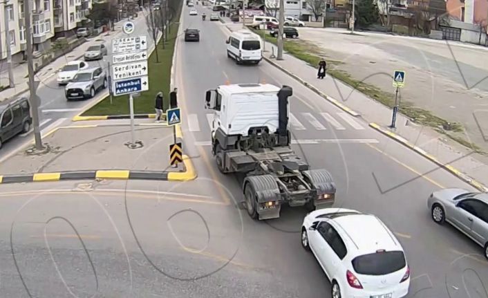 Sakarya’da yaya geçidinde vatandaşlara yol vermek için yavaşlayan tıra arkadan otomobil çarptı. Meydana gelen trafik kazası kameralara yansıdı.