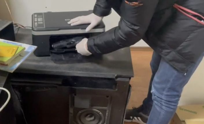 İçeride yapılan aramalarda ise hoparlörün ve yazıcının içerisindeki de olmak üzere toplamda 5 adet ruhsatsız tabanca ve şarjörleri, 13 adet tabanca namlusu, 4 adet şarjör gövdesi, 1 adet şarjör, 75 adet mermi, 4 adet namlu açmada kullanılan demir törpü, 3 adet namlu zımparası, 1 adet namlu kontrol aparatı ve 4 adet şarjör yayı ele geçirildi.