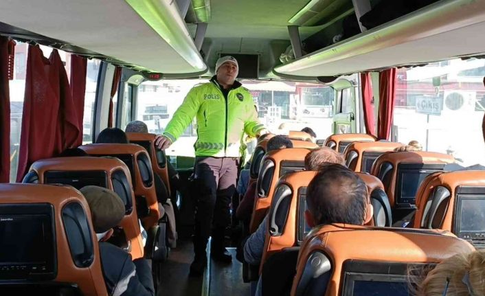 Düzce(İHA) – Düzce’de yılbaşı tedbirleri çerçevesinde trafik ekipleri şehirlerarası otobüs terminalinde uygulama yaptı. Yeni yıla aileleriyle girmek için yola çıkanlar emniyet kemeri konusunda polis ekipleri tarafından uyarıldı.