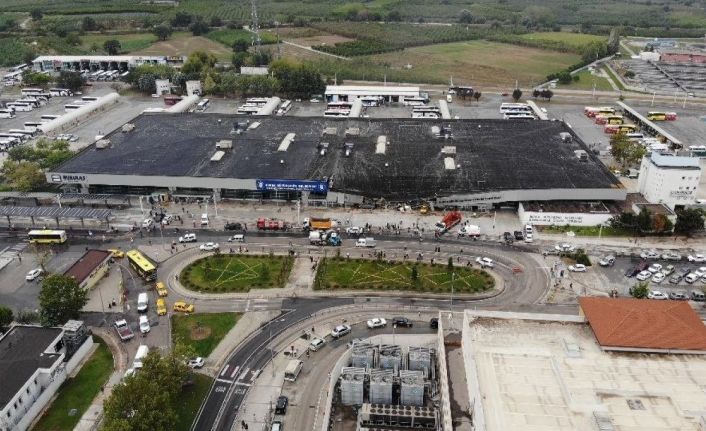 Yıldırım düşmesi sonrası çatısı yıkılan Otobüs Terminali havadan görüntülendi