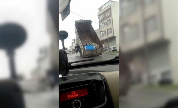 Olay fabrikalar bölgesinde dün meydana geldi. Kamyon kasasındaki yük yokuş yukarı yolda geriye doğru kaydı. Yükün geri doğru kaymasıyla kamyonun ön tekerleri havaya kalktı. Kamyonun ön tekerlerinin havadayken ilginç anı vatandaşlar tarafından cep telefonu kamerası ile kaydedildi.