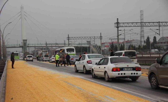 Kocaeli’nin İzmit ilçesinde seyir halindeki mısır yüklü kamyonun kapağı açılınca mısırlar yola döküldü.