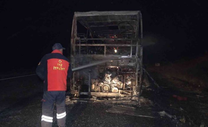 Kırıkkale-Kırşhehir kara yolu üzerinde alev alev yanan yolcu otobüsünden geriye demir iskelet kaldı. Yangın, itfaiye ekiplerince uzun uğraşlar sonucu söndürüldü. Yolcular ise yara almadan kurtuldu.